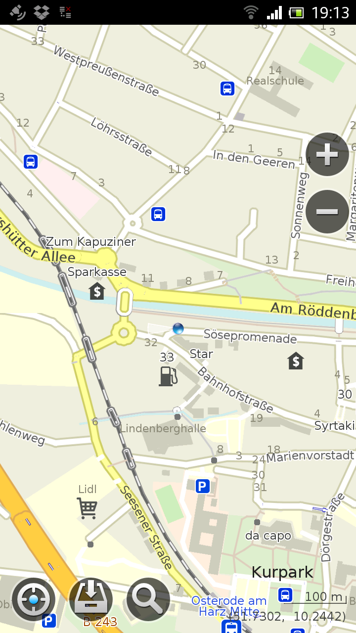 Diese App ist für mich die große Überraschung. Sie basiert auf OSM-Kartenmaterial, dass man sich vorab zu Hause runterladen kann. D.h. man braucht während der Wanderung keine Datenverbindung ! Über GPS kann auch der genaue Standort angezeigt werden. Ein Tracking oder eine Trackverwaltung geht nicht. Hat man sich aber gnadenlos im Wald verirrt, bringt das Kartenmaterial nicht viel. In Städten ist die App ganz ok, aber mehr auch nicht.