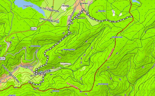 Das rot-gestrichelte ist der Harzer Hexenstieg und der graue Track die Umleitung mit etwas mehr Spaß.