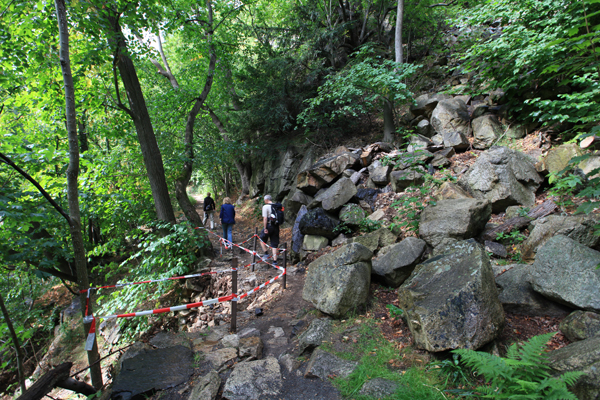 Bereits zwischen dem Bodekessel und dem Gasthaus Königsruh sind Felsen den Hang herabgestürzt und haben den Hexenstieg förmlich halbiert. Ich bin etwas verwundert, dass dieser Bereich eigentlich gar nicht richtig in den Diskussionen vorkommt. Wäre man hier konsequent, müsste der gesamte Wanderweg zwischen Treseburg und Thale gesperrt werden. Ist er aber nicht.