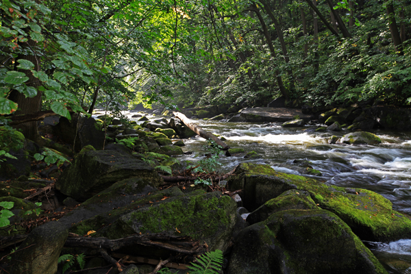 Der Harzer Hexenstieg führt nun auf der anderen Bodeseite in Richtung Waldkater weiter. Der Weg ist ziemlich ähnlich und wie im gesamten Bodetal liegen am gesamten Hang einige Felsen. Der Weg ist lediglich etwas steiniger. An der Brücke beim Waldkater geht’s dann wieder zurück auf die Originalroute.