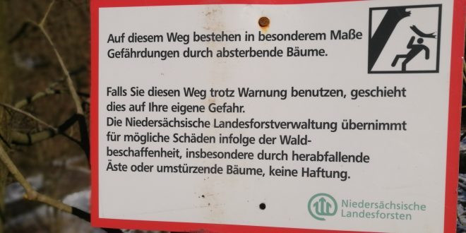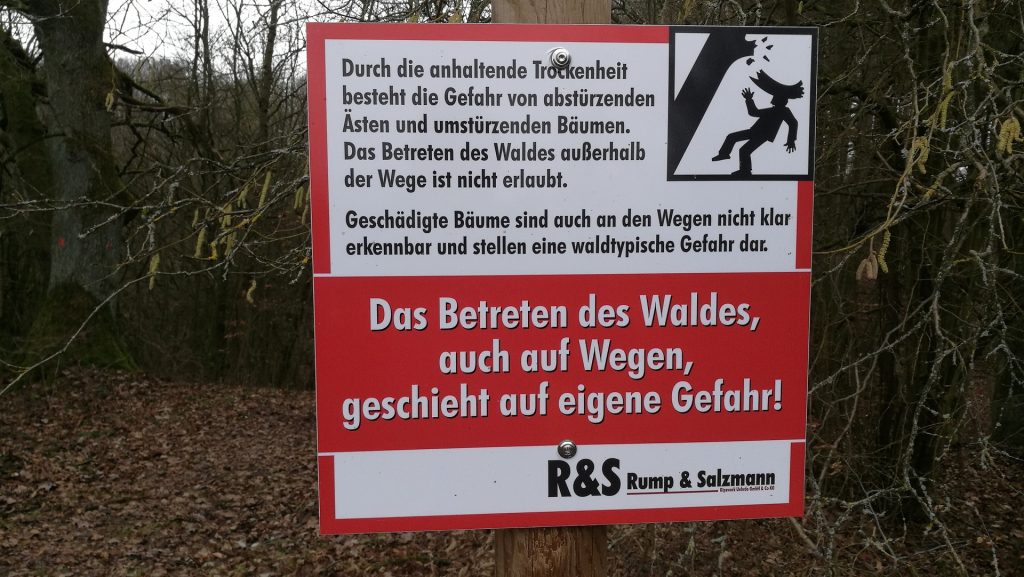 Obwohl im Harz oder wie auf dem Foto auf dem Karstwanderung im südlichen Vorharz immer wieder Hinweisschilder zu sehen sind, die auf die Gefahr von abstürzenden Ästen und umstürzenden Bäumen mit dem Zusatz des Betretens auf eigene Gefahr hinweisen, ist die Rechtslage recht eindeutig: Wer den Wald betritt, macht dies auf eigene Gefahr | eigenes Risiko. Diese Schilder sind im Prinzip nicht notwendig, sind aber ein guter Hinweis auf die aktuelle Situation im Wald und besonders am Harz.