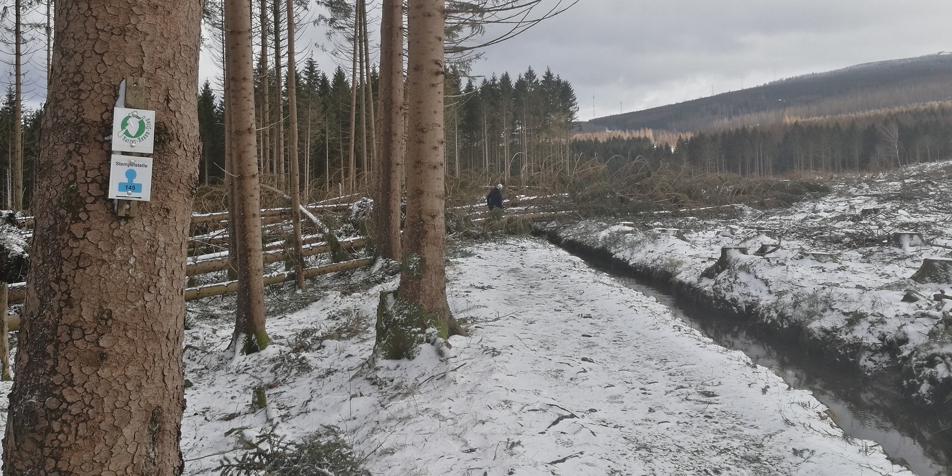 Durch das Waldsterben ist der Harzer Wald in einem schlechten Zustand und somit der windanfällig, d.h. Äste können unmittelbar abbrechen und Bäume umfallen. Jetzt könnte man sagen, dass sowieso gefühlt der halb Wald im Harz nicht mehr steht, aber sind immer noch genügend Abschnitte, in denen Bäume mit dem hohen Gefahrenpotential stehen. Wie auf dem nächsten Foto (vom 05.02.2022) zu sehen sind an einer Stelle mit schon wenig Bäumen diese im 5er-Pack umgefallen. Hier kann man nicht einfach ausweichen, wenn man sie fallen sieht.